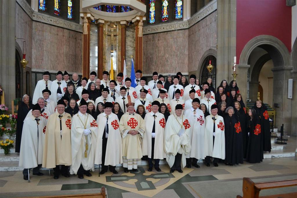In the course of his thought-provoking homily Bishop Keenan evoked that historical dimension, as he reminded the large gathering of Knights and Dames of the importance of their commitment to the support of the Church in the Holy Land, quoting Psalm 137 “If I forget you, Jerusalem, let my right hand wither”. He highlighted that the population of Christians in the land of Our Lady’s birth has now diminished to a mere 1% of the overall population and that there was a need to act to redress this. But he also pointed to the sense of confusion which can arise in people’s minds in the present situation over what they should do or the way they should follow. As a means to overcome this Bishop Keenan emphasised the important role of Mary as intercessor for those living in the land of her birth and also for those who seek to help them He therefore exhorted the Lieutenancy to remember Mary as the key intercessor and protector of the land in which both she and her son Christ Our Lord were born and lived. And he reminded Knights and Dames that the earthly Jerusalem towards which many of their efforts are dedicated is an image which leads to the heavenly Jerusalem to which we all aspire.