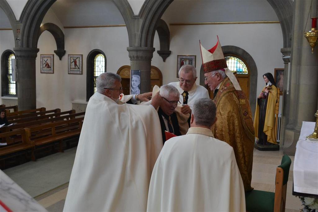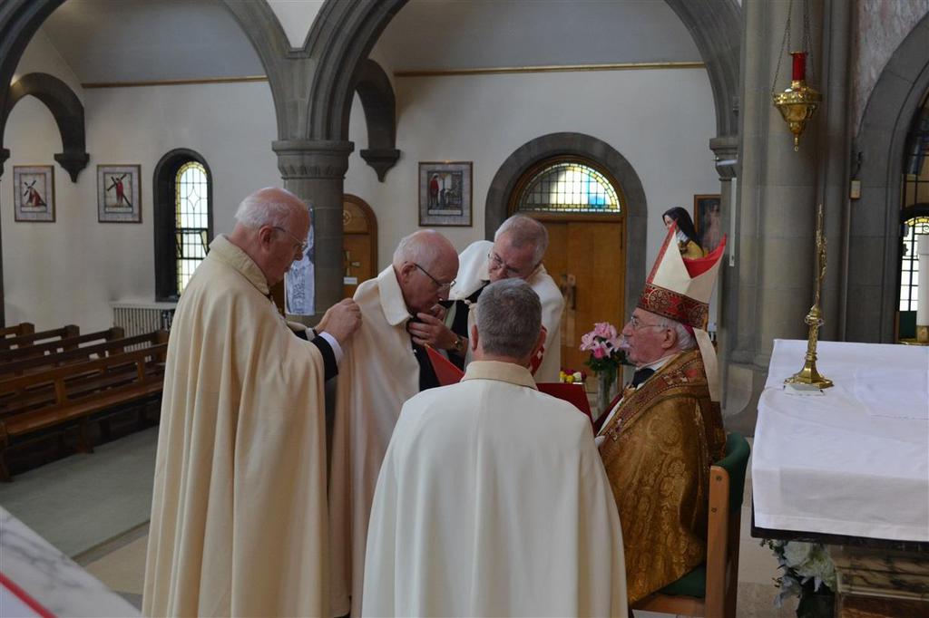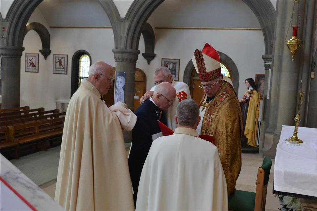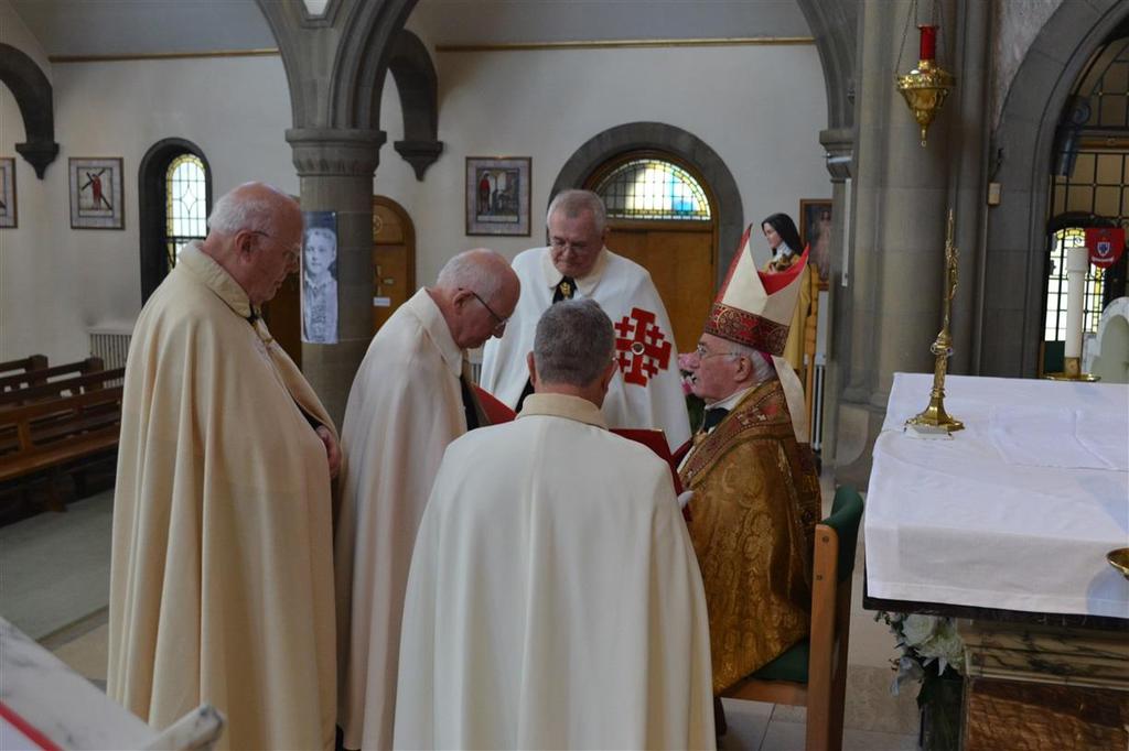 In the course of the ceremony Archbishop Conti clothed each bishop in a white mozzetta which bears the distinctive red cross of Jerusalem – a square cross with a smaller, similar cross in each quarter, the whole representing the five wounds of Christ. He clothed each of the three new knights with a large white cloak, also bearing the Jerusalem cross. The Grand Prior also placed around the neck of all five new members a red enamelled Jerusalem cross which members wear on ceremonial occasions.