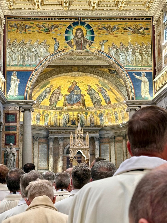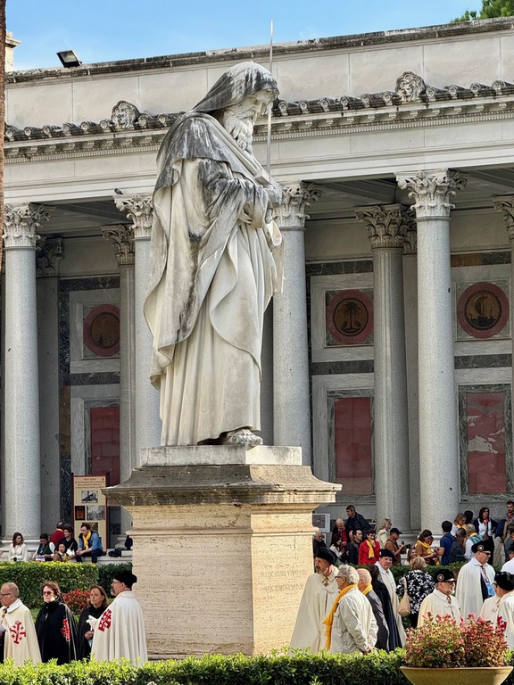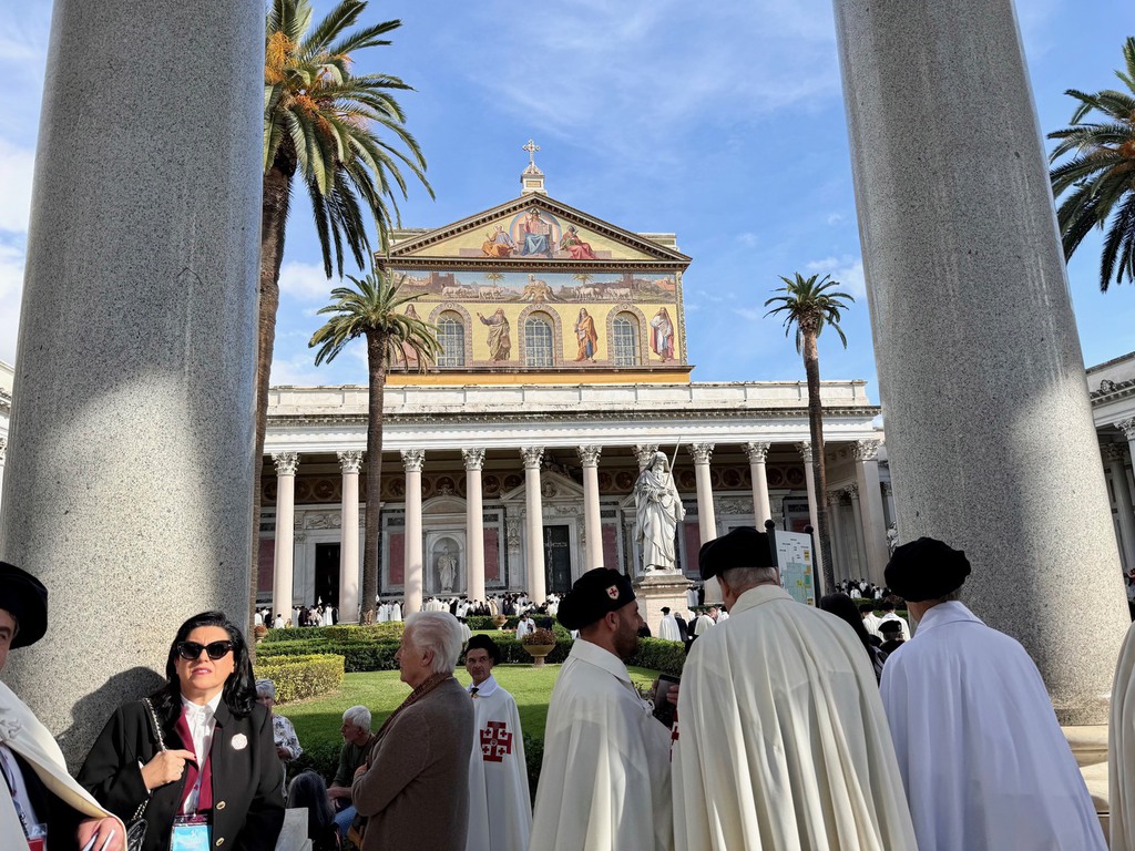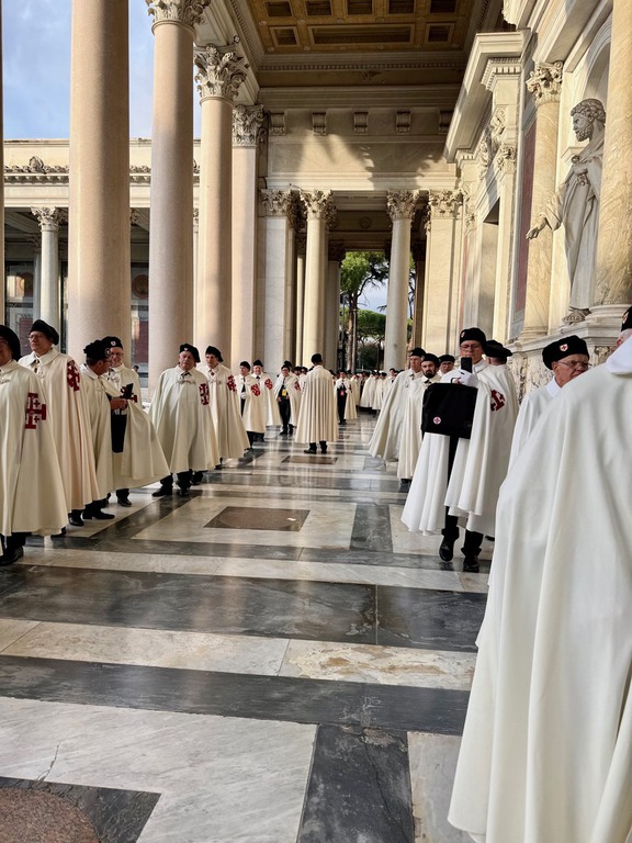 On Tuesday we set off to the Basilica of St Paul outside the Walls. A very impressive procession of over 3000 Pilgrims, led by our Grand Master His Eminence Cardinal Filoni, processed through the Holy Door into the Basilica. A welcome address by his Eminence was followed by a wonderful opening Mass. The multilingual Pilgrims’ booklet, written in Latin, Italian, French, German and English ensured that Pilgrims from around the world could participate fully in all the Pilgrimage events.