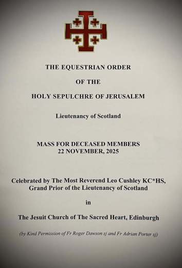 On Saturday 22nd November 2025, a large number of members of the Lieutenancy of Scotland gathered in the church of the Sacred Heart, Laurieston (Edinburgh) for the annual Mass for our deceased members, celebrated by Archbishop Cushley, the Grand Prior of the Lieutenancy.