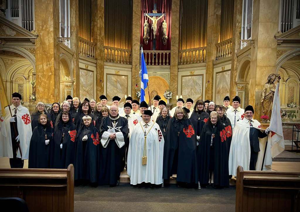 I am thinking, not least, of the impressive sight we make when we gather, vested at the moment of the Requiem Mass of a deceased brother or sister. The whole body of mourners watches on inspired by the homage we pay to our brethren at the last, in our guard of honour formed at their funeral. Robed in our heraldic dress, we stand on guard along the aisle, accompanying our brother or sister to the sanctuary before taking our seats across from the family as a sign of fraternal ties similarly close to family bonds. At the conclusion of the sacred rites we reassemble in processional line behind the Cross, leading our brother or sister to the final resting place.